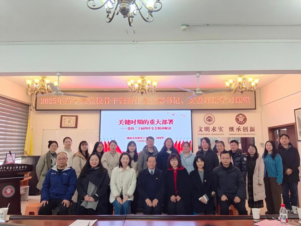 为深入学习领会党的二十届四中全会精神的重大意义、核心要义与实践要求,引导学院师生党员、辅导员及团学青年骨干切实把思想和行动统一到党中央决策部署上来,进一步提升基层党组织的凝聚力与战斗力。2025年12月18日下午,药学院党委组织开展党校骨干暨新任党支部书记、支委理论学习课堂与团学青年大讲堂,特邀湖南省教育工委党校原常务副校长刘国华教授作题为“关键时期的重大部署——深入学习贯彻党的二十届四中全会精神”的...