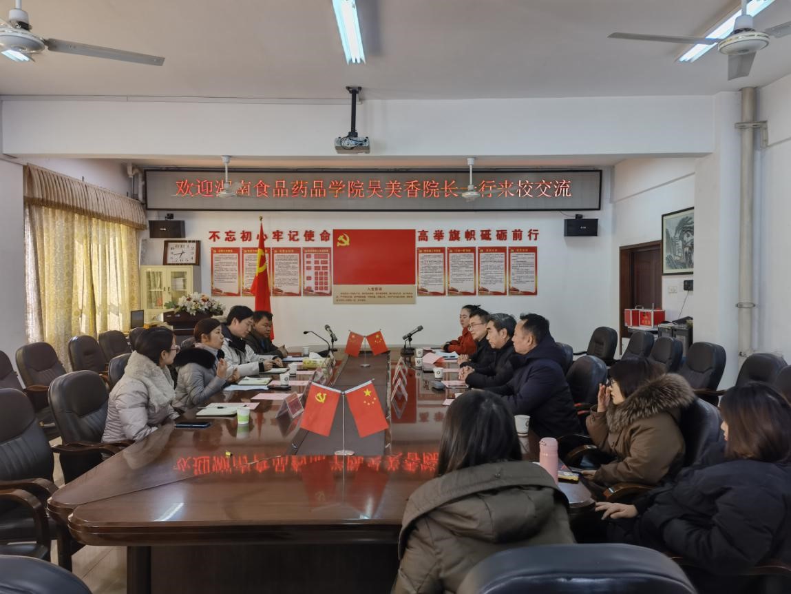 2021年1月8日,湖南食品药品学院食品学院院长吴美香、副院长徐魏、食品营养检测教研室主任徐小娟、食品安全监管教研室主任胡梦红一行来我校交流访问。药学院夏新华院长、裴刚副院长、食品专业负责人、学科带头人杨勇教授及食品专业相关老师参加了此次座谈会,会议由裴刚副院长主持。