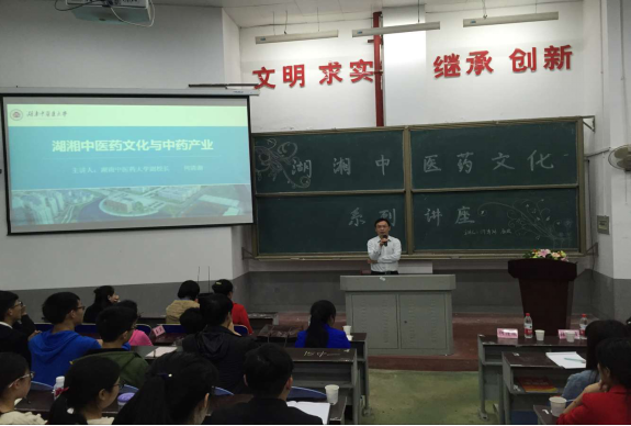 2016年4月8日晚7:00在1307教室面向2015级中药1、2、3班以及中药资源与开发班全体同学开展了湖湘中医药文化系列讲座之“湖湘中医药文化与中药产业”。主讲人是湖南中医药大学副校长何清湖教授,此次讲座由药学院党总支书记张秋雁教授主持。药学院中药系主任周小江教授、药学院学生科副科长段智恩老师、团委书记黎亚老师、药学院中药鉴定生药学教研室邵莉老师和药学院中药学专业认证办公室秘书袁志鹰老师出席了此次讲座。