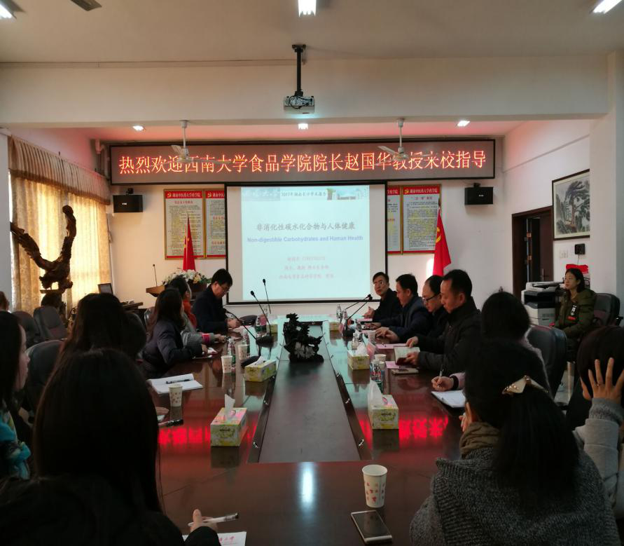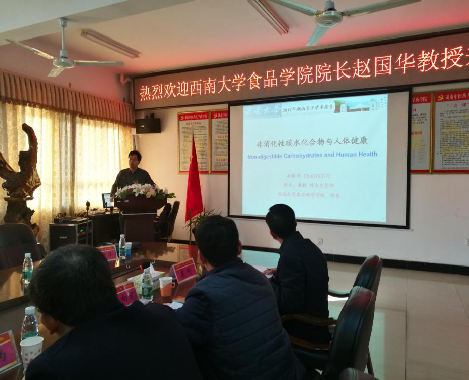 有朋自远方来,不亦悦乎!2017年12月8日星期五上午8:30西南大学食品科学学院院长赵国华教授应邀至我校做学术报告,报告会于B栋实验楼四楼药学院会议室举办。