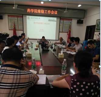 9月25日下午,药学院维稳工作会议在药学院会议室召开,会议由学院党委书记张秋雁主持,学院副书记副院长刘向前、副院长夏新华、副院长裴刚、各党支部书记、各室各中心各平台负责人参加了会议。