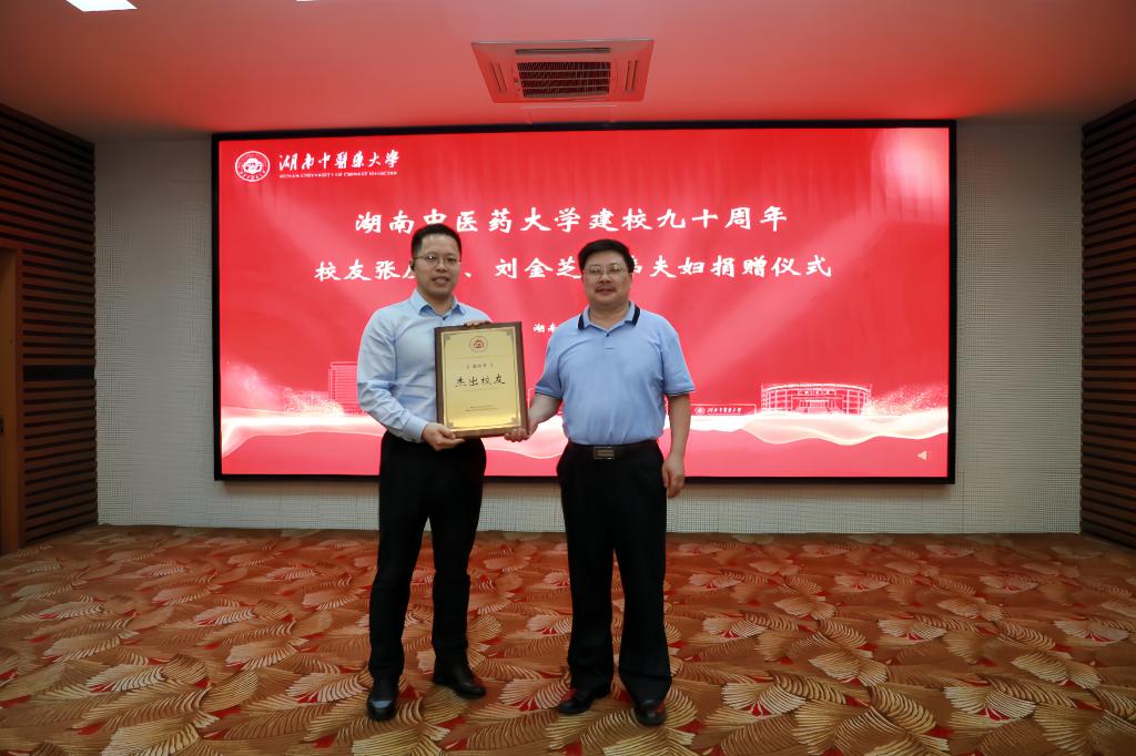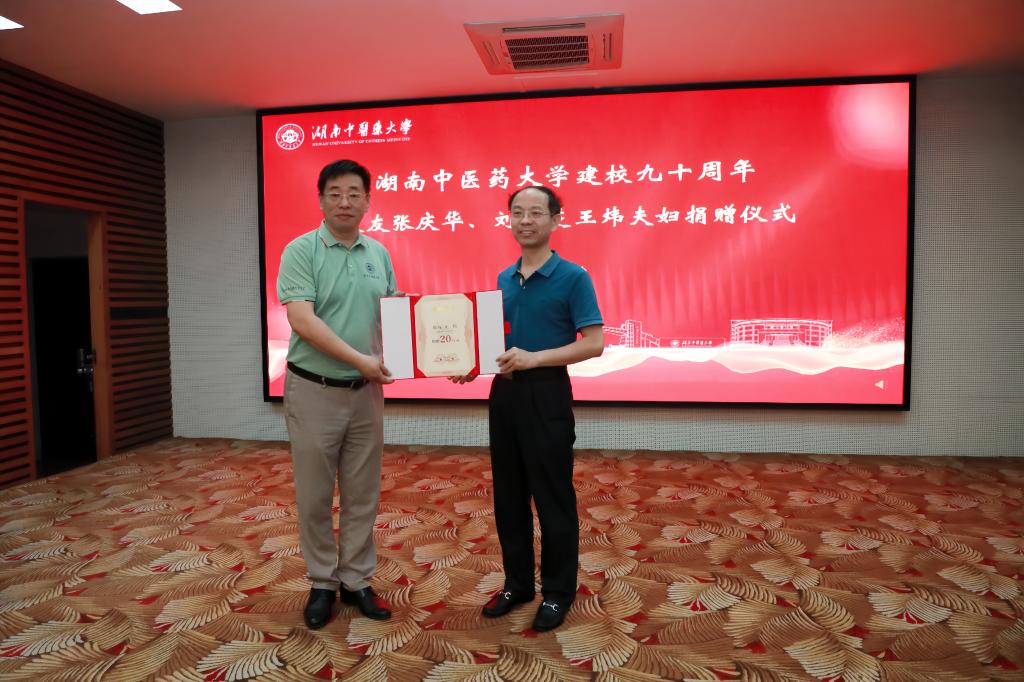 为祝贺学校建校90周年,1992级中医学专业校友、湖南方盛制药股份有限公司党委书记张庆华捐赠200万元,1990级中药学专业校友、我校药学院院长王炜以夫妇二人名义捐赠20万元回馈母校,支持学校教育事业,关爱学生成长成才。