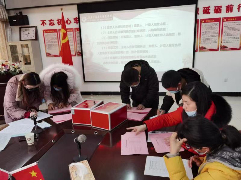 王炜副院长首先带领全体党员奏唱国歌后宣布会议开始,曹一瑜书记宣读选举办法并举手表决通过,纪检委员陈胜璜同志介绍候选人产生程序及提名并举手表决通过总监票人、监票人、计票人名单,清点人数后进行投票。