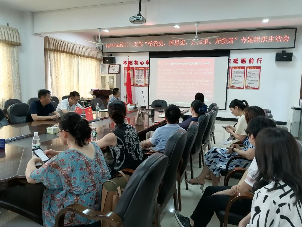 7月9日下午,药学院第二职工支部在院会议室召开了“不忘初心、牢记使命”支部书记讲党课学习活动。药学院党委书记曹一瑜、副院长裴刚和第二职工支部党员参加了会议。