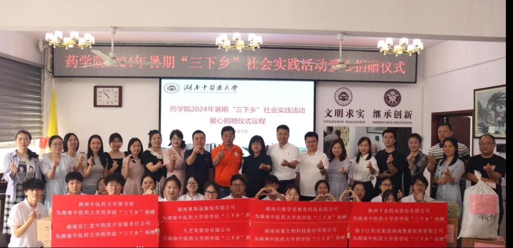 7月3日,我院举行2024年暑期“三下乡”社会实践活动爱心捐赠仪式。学院党委书记张熙、院长王炜,九芝堂股份有限公司等多个企业及单位代表,学院学生科全体老师和全体学生志愿者参与活动。仪式由学院党委副书记贺哲淳主持。
