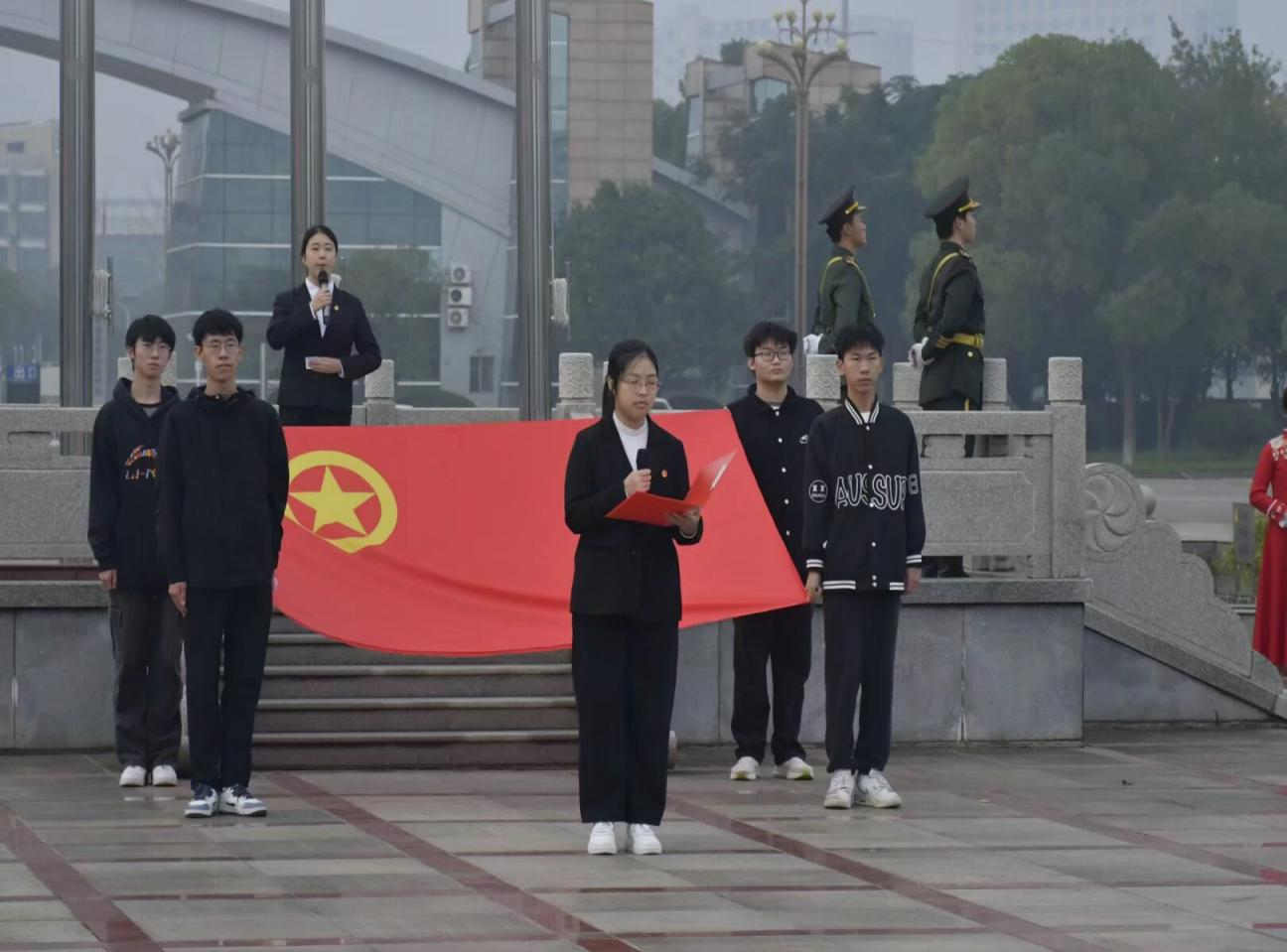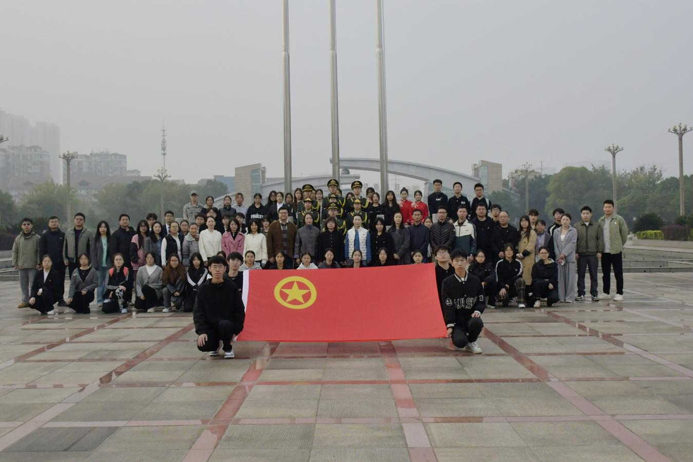 2025年10月27日清晨,湖南中医药大学药学院于含浦校区南大门国旗台广场庄严举行“铭记历史、缅怀先烈、珍爱和平、开创未来”升旗仪式。出席本次升旗仪式的有药学院党委书记张熙、党委副书记方圆、师生党支部书记、学生科全体辅导员以及2025级班主任和新生。