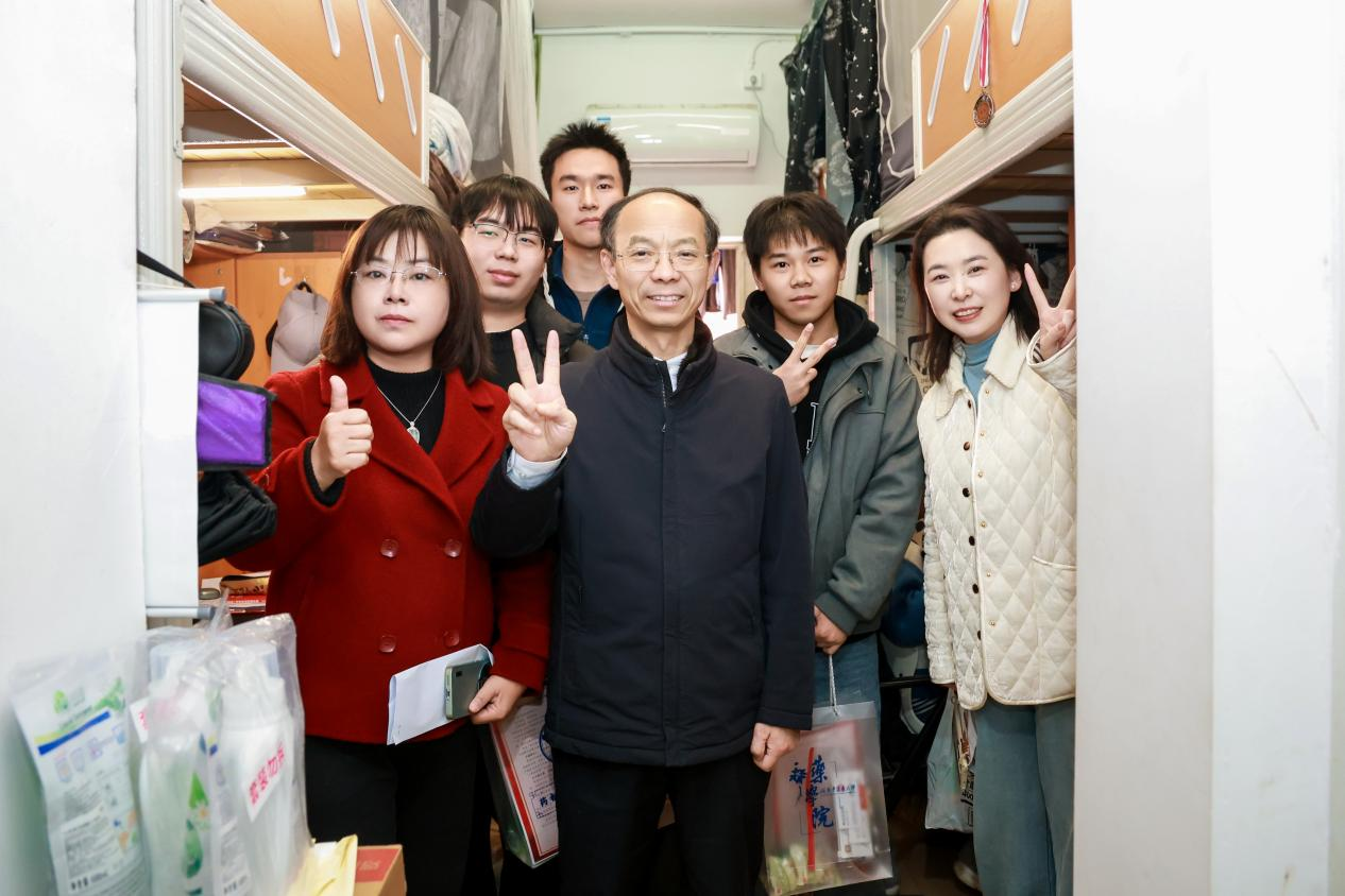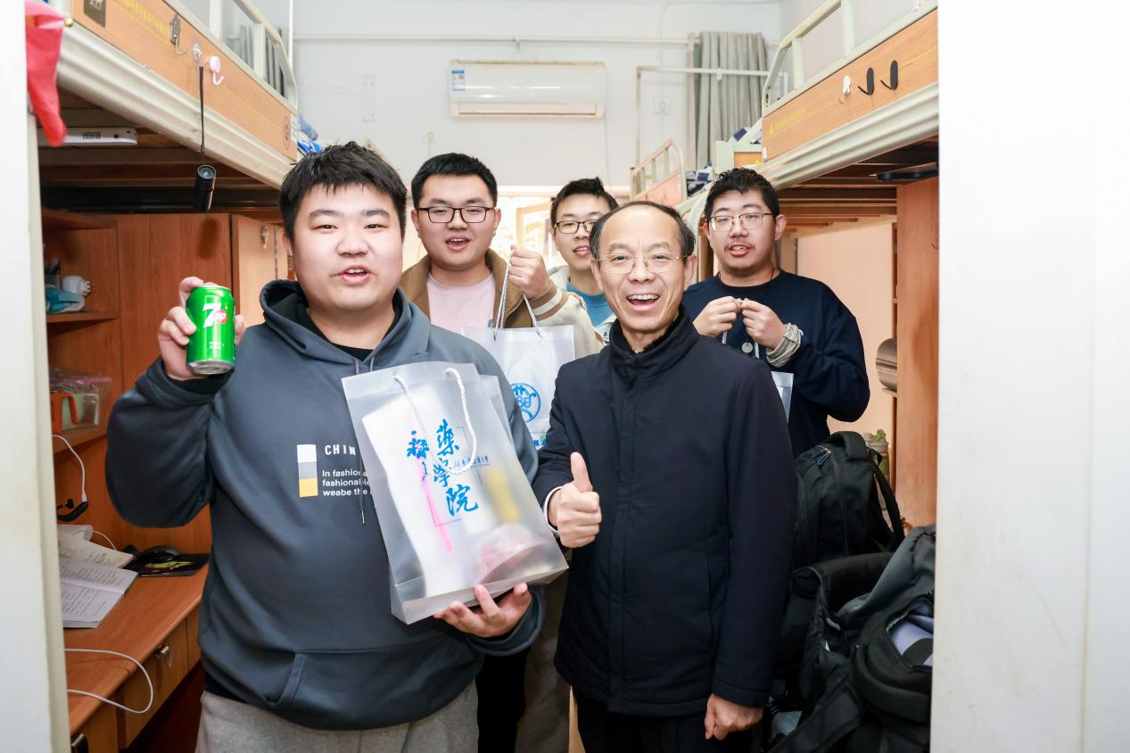 声声问候暖人心,句句嘱托寄厚望。慰问过程中,领导老师们细致询问大家的复习进度、备考节奏以及生活起居情况。针对学子们备考后期面临的压力,老师们耐心疏导情绪,叮嘱大家“合理规划时间,张弛有度”“注意添衣保暖,保证睡眠质量”“遇到困难及时向学院和辅导员求助”。廖校长亲切勉励药院学子:在研考冲刺阶段,劳逸结合、察漏补缺、充分调动知识储备,轻装上阵、从容应考、顺利“上岸”。亲切的话语、温暖的关怀,让同学们在紧张的备考氛围中倍感鼓舞。