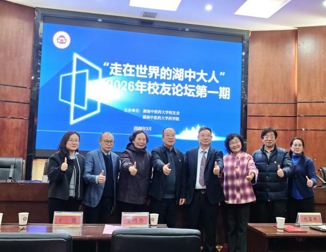 2026 年 3 月 17 日下午,由湖南中医药大学校友会、药学院联合主办的 “走在世界的湖中大人” 第一期校友讲座在国际教育学院报告厅顺利举行。本次讲座特邀了两位85 级中药专业优秀校友——中山大学第七附属医院药学部中心主任、深圳市卫健委首批“菁英人才项目学科带头人”周本杰主任和广东省食品药品监督管理局原副局长严振教授担任主讲嘉宾,会议由副校长刘富林教授主持,药学院院长王炜及学院师生、校友代表百余人参会。