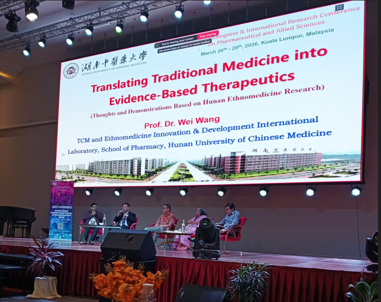3月26日至30日, 制药与整合科学国际研究会议暨创新大会在马来西亚思特雅大学召开。我院院长王炜教授受邀参会,并以《如何将传统医学转化为循证疗法- 基于湖南民族医药研究的思考与实践”》为主题作学术报告,系统展示在传统医药现代化研究领域的创新思路、实践成果与国际合作进展,向世界传递湖湘中医药文化魅力,推动我院国际学术交流合作迈上新台阶。