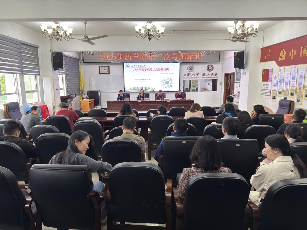 4 月 21 日,药学院会议室举办2026 年度第二次研究生导师专题培训会。本次会议旨在持续加强药学院研究生导师队伍建设,压实导师立德树人职责,提升导师履职能力与实验室安全管理水平。副院长彭彩云主持培训会,党委副书记方圆、副院长欧阳文及全体研究生导师参会。
