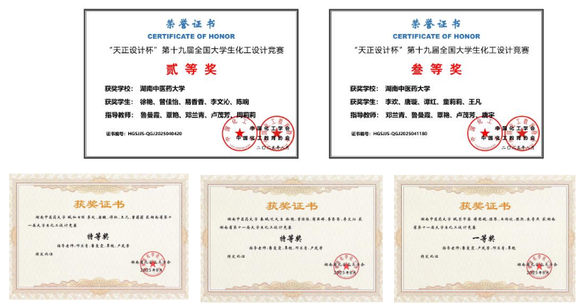 我院学生在国家级、省级、厅级等一系列“大学生化工设计竞赛”中喜获丰收,展现了我校在跨学科创新人才培养方面的突出成果。我院学生以赛促练、以赛促学,不仅深化了对化工工程设计实践的理解,亦增进了将中医药资源特色与现代工程技术相结合的实践能力,更充分体现了我院近年来积极推进“新工科”与“中医药”融合,鼓励师生参与跨学科竞赛,提升创新实践能力的教学成果。