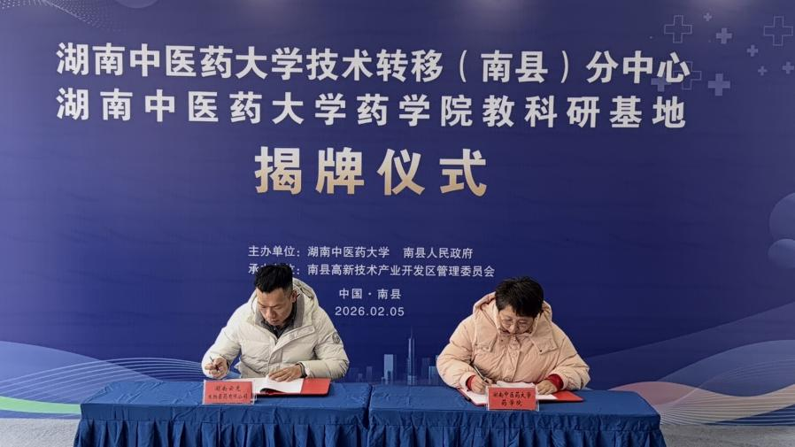 2月5日,湖南中医药大学药学院教科研基地揭牌仪式在南县高新区隆重举行。湖南中医药大学党委书记戴爱国,党委委员、副校长刘富林,药学院党委副书记、院长王炜,南县县委副书记、县长沈小星等校地领导出席仪式,共同见证这一政校企深度合作的重要时刻。